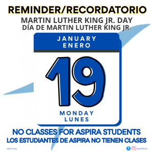 Martin Luther King Jr. Day; Non-Attendance Day Students + Add to Google Calendar + iCal / Outlook export 00 days 00 hours 00 minutes 00 seconds Date Jan 19 2026 Time All Day More Info Read More Location Aspira Antonia Pantoja High School 3121 N. Pulaski Rd. Chicago, IL 60641 Website https://aap.aspirail.org/ Read More Share this event